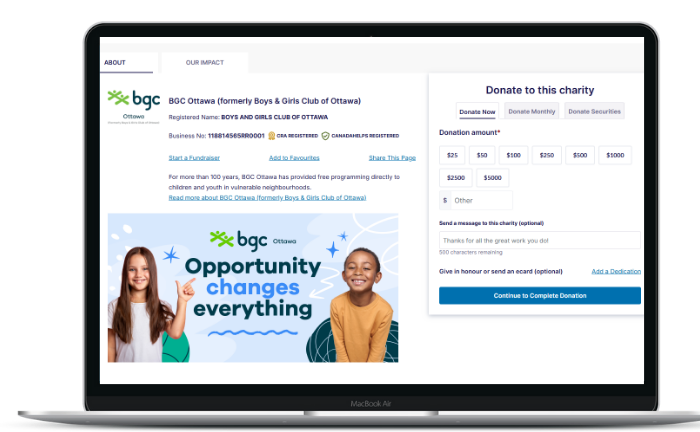 BGC Ottawa maintains an active charity profile on the CanadaHelps platform, which serves as a discovery tool for donors searching for children’s charities in Ottawa. “The team recognizes the profile’s importance in attracting new donors, particularly guest donors researching where to give. The charity profile has shown to be a big influencer in doing that,” Amanda noted, and consistently looks to update their profile with refreshed language and branding to better reflect the charity.