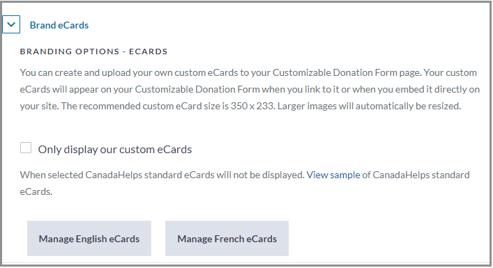 Almost 10% of one-time donations through CanadaHelps are donations made in honour or in memory of someone, where the donor has opted to send a free eCard. You can create and upload your own eCards using visuals that reflect your brand and mission or choose from several standard options to add to your Customizable Donation Forms.