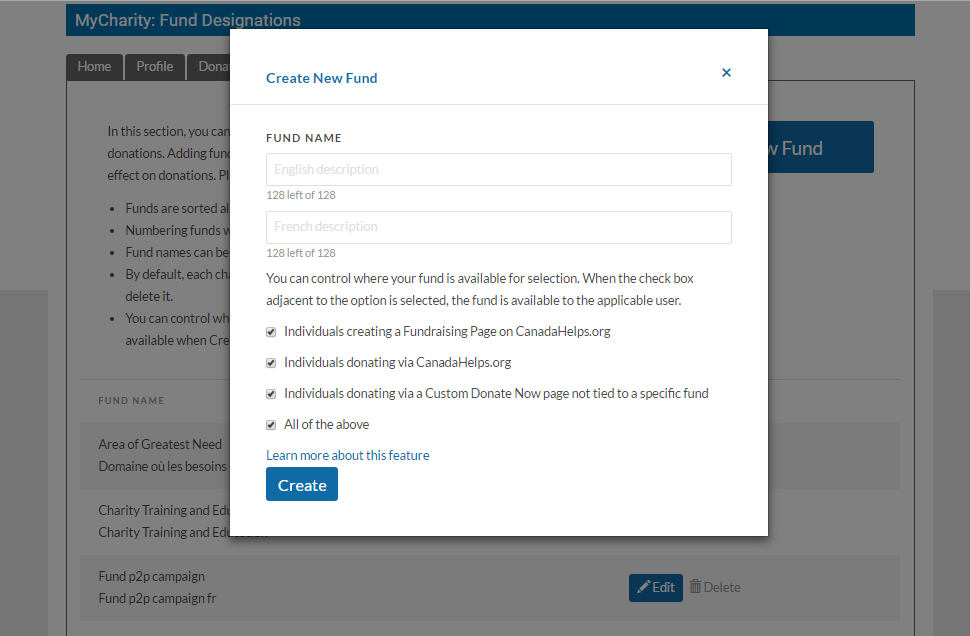 The above information is also available when you click the “Learn more about this feature” when creating a new Fund while logged into your CanadaHelps Charity Account.