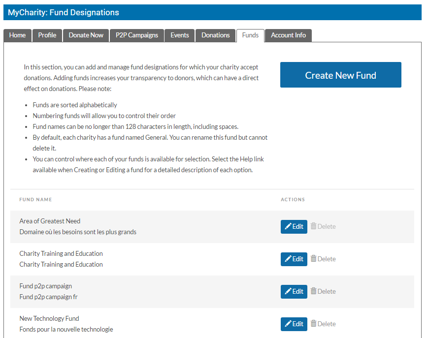 In order to best accommodate the new changes, we have re-designed the Funds Tab in your CanadaHelps Charity Account. When you log into your account and select the Funds Tab, you will now see the following: