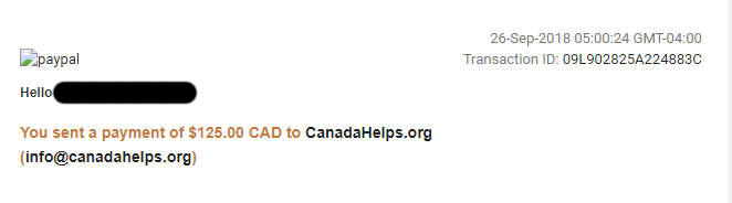 CanadaHelps has been contacted by a number of individuals regarding an email they received for a $125 donation to Turning Point Society of Central Alberta on September 26. This email is claiming to be sent by PayPal regarding a donation made using CanadaHelps. These are not legitimate emails and were not sent by PayPal or CanadaHelps.