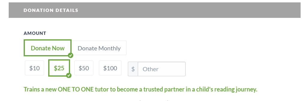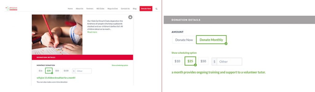 Un moyen de garantir une source régulière de financement pour votre organisme, c’est d’établir un programme de dons mensuels. Créez un formulaire qui encourage vos sympathisants à donner régulièrement en devenant des donateurs mensuels. Suggérez différents montants de dons mensuels, et lancez un clair appel à l’action en proposant des exemples concrets de l’impact qu’ils peuvent produire (p. ex., combien de dîners à l’école on peut fournir en un mois avec un montant de 25 $). Proposez à vos sympathisants de devenir des donateurs mensuels en mettant en évidence cette option dans vos communications, et aidez-les à comprendre que les dons mensuels sont une façon courante de faire des dons.