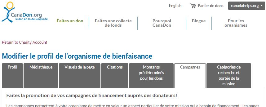- Lorsque vous saisissez l’information au sujet de votre cadeau à l’onglet Info sur la campagne, n’oubliez pas de sélectionner la valeur de votre cadeau dans le menu déroulant Type de campagne.