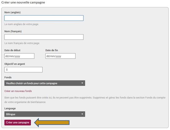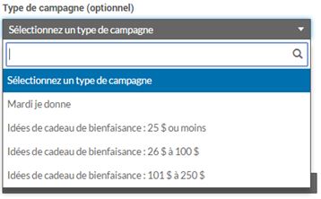 - Lorsque vous saisissez l’information au sujet de votre cadeau à l’onglet Info sur la campagne, n’oubliez pas de sélectionner la valeur de votre cadeau dans le menu déroulant Type de campagne.
