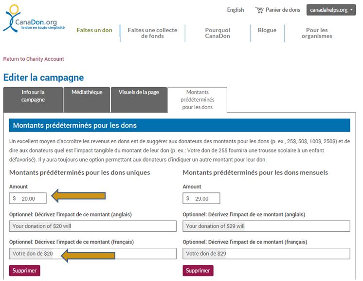 - À l’onglet Montants prédéterminés pour les dons, indiquez la valeur de votre cadeau de bienfaisance ainsi que l’impact du don.