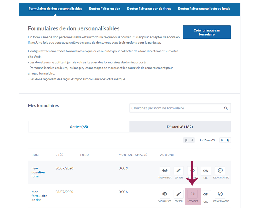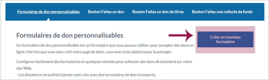 2. Cliquez sur « Créer un nouveau formulaire » afin de préparer un formulaire pour la collecte de dons mensuels.