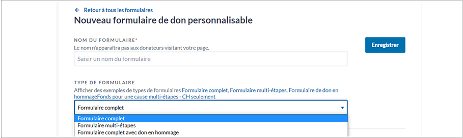 3. Donnez à votre formulaire un nom, et choisissez un type de formulaire parmi les trois types offerts en option : Formulaire complet, Formulaire multi-étapes, et Formulaire complet avec don en hommage (qui comprend des cartes électroniques).