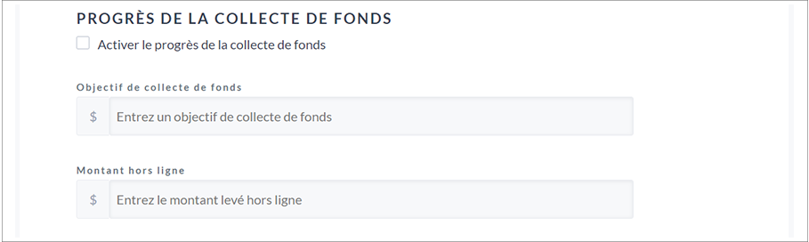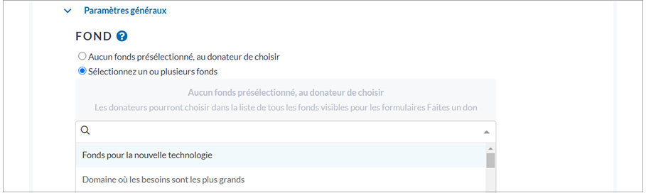 4. À la section Paramètres généraux, vous avez l’option de permettre à vos donateurs de choisir à quel fonds donner, et l’option d’afficher les progrès de votre campagne.