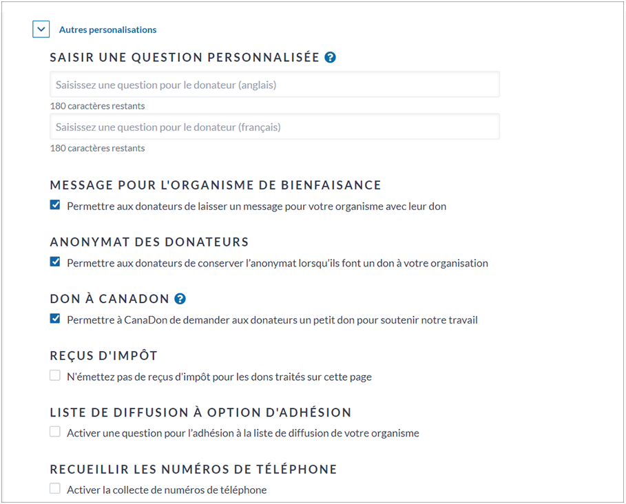 6. À la section Autres personnalisations, vous pouvez appliquer d’autres paramètres, p. ex., poser des questions à vos donateurs, permettre aux donateurs de laisser un message avec leur don, et activer l’option don à CanaDon. Vous pouvez aussi désactiver les reçus fiscaux (fonction activée par défaut afin d’envoyer instantanément un reçu fiscal pour chaque don), et activer l’inscription à la liste de diffusion, et la collecte de numéros de téléphone.