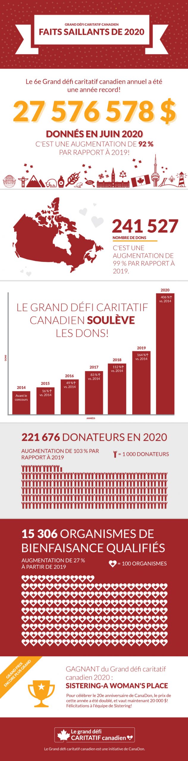 Le défi caritatif 2020 a permis d’amasser un total de 27 576 578 $ pour les organismes de bienfaisance, soit 92% de plus que l’an dernier ! D’un océan à l’autre, des centaines de milliers de Canadiens ont manifesté leur soutien et leur générosité en amplifiant et en donnant aux causes qui leur tiennent à cœur.