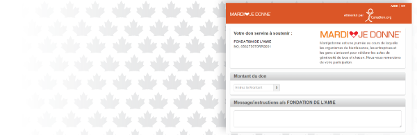 En tant qu’organisme de bienfaisance canadien enregistré, vous avez accès à une page de dons au nom de votre organisme pour Mardi je donne. Pour accéder à votre page, cliquez sur le bouton ci-dessous, faites une recherche en saisissant le nom de votre organisme et sélectionnez-le parmi les résultats. Vous serez dirigé vers la page de dons de votre organisme pour MardiJeDonne, que vous pouvez utiliser pour accepter des dons en ligne. Le traitement complet des dons, y compris la délivrance automatique des reçus, sera effectué par CanaDon et intégré harmonieusement à votre compte CanaDon. Obtenez votre page de dons.