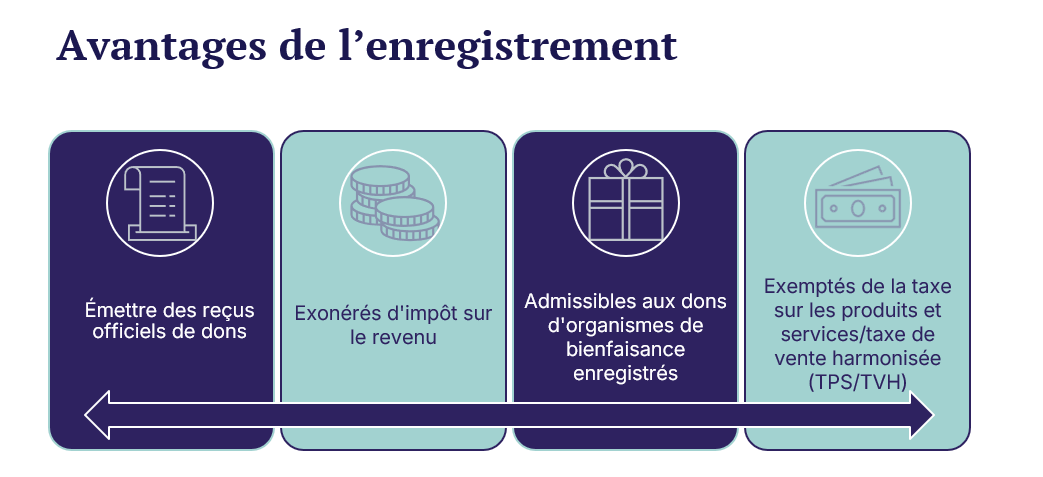 Une fois approuvés, les organismes de bienfaisance bénéficient d’avantages tels que la possibilité d’émettre des reçus officiels de dons utilisables aux fins d’impôt, l’exonération de l’impôt sur le revenu, la possibilité de recevoir des dons de donataires reconnus et un possible allègement de la TPS/TVH.