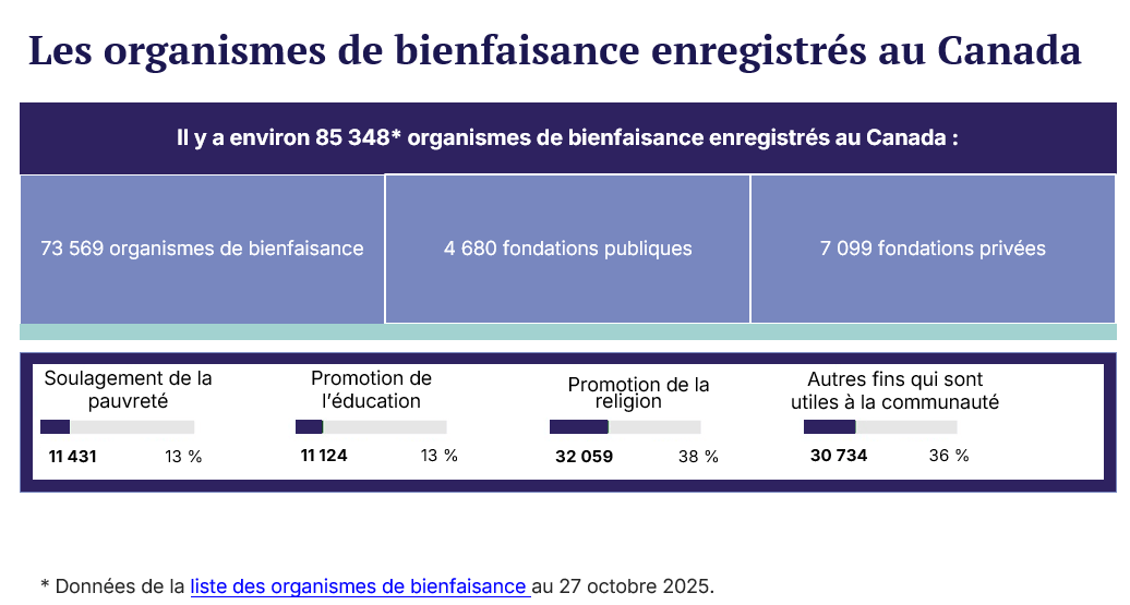 Le secteur de la bienfaisance emploie 2,7 millions de Canadiens, soit un travailleur sur dix, et contribue à hauteur d’environ 8,3 % du PNB, ce qui représente 225 milliards de dollars par année. Ce secteur mobilise aussi les Canadiens et les Canadiennes qui ont donné plus de 11 milliards de dollar en 2022, auxquels s’ajoutent 4,2 milliards de dollars versés par les entreprises en 2021, soulignant ainsi l’impact économique et social du secteur. Le « secteur du bénévolat » se compose à la fois d’organismes sans but lucratif et d’organismes de bienfaisance enregistrés. Bien que leur nombre fluctue avec les nouveaux enregistrements et les dissolutions d’organismes, il se maintient généralement à environ 86 000 organismes de bienfaisance enregistrés.